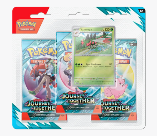 With deep trust and steady guidance, Trainers help bring out the best in their Pokémon. The bond they share empowers them to act as one in battle as they push their strength to the limit, including as Pokémon ex! Team up with N’s Zoroark ex, Iono’s Bellibolt ex, Lillie’s Clefairy ex, Hop’s Zacian ex, and more Trainer’s Pokémon, and discover the unstoppable power of friendship in the Pokémon TCG: Scarlet & Violet—Journey Together expansion!Each blister comes with 3 Journey Together booster packs and a promotional card of Yanmega.