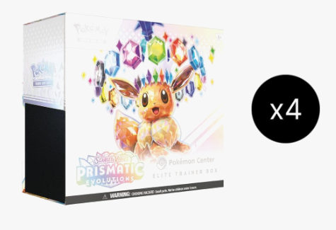 Card Text:The Pokémon TCG: Scarlet & Violet — Prismatic Evolutions Pokémon Center Elite Trainer Box Case contains 4 Prismatic Evolutions Pokemon Center Elite Trainer Boxes.