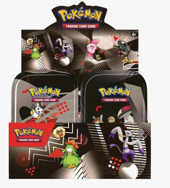 Each display contains 1 of each Prismatic Evolutions Mini Tin design (for a total of 8). Each tin contains 2 booster packs, 1 metallic coin and 1 Pokémon art card.